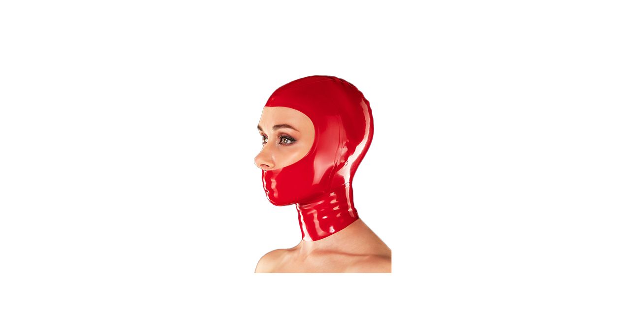 Latexmaske mit geschlossenem Mund sowie geöffneten Augen und Nase, gefertigt aus hochwertigem Latex. Sie verfügt hinten über einen Reißverschluss. Die Öffnung ist mit einer Naht verstärkt.